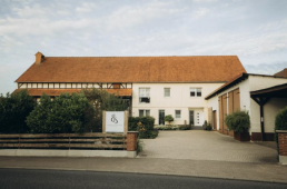 Hinweis zur Anfahrt: Hinter dem Schild sind zwei Parkplätze für Besucher reserviert. Du findest mich im ersten Stock des hellgelben Scheunenausbaus.